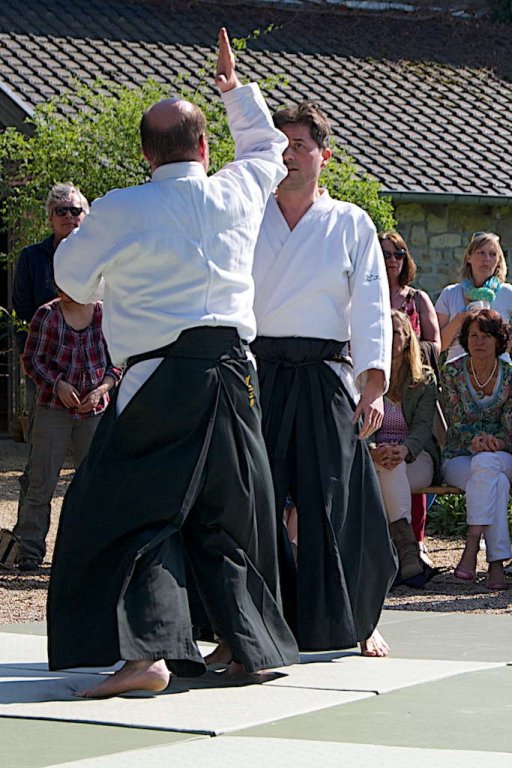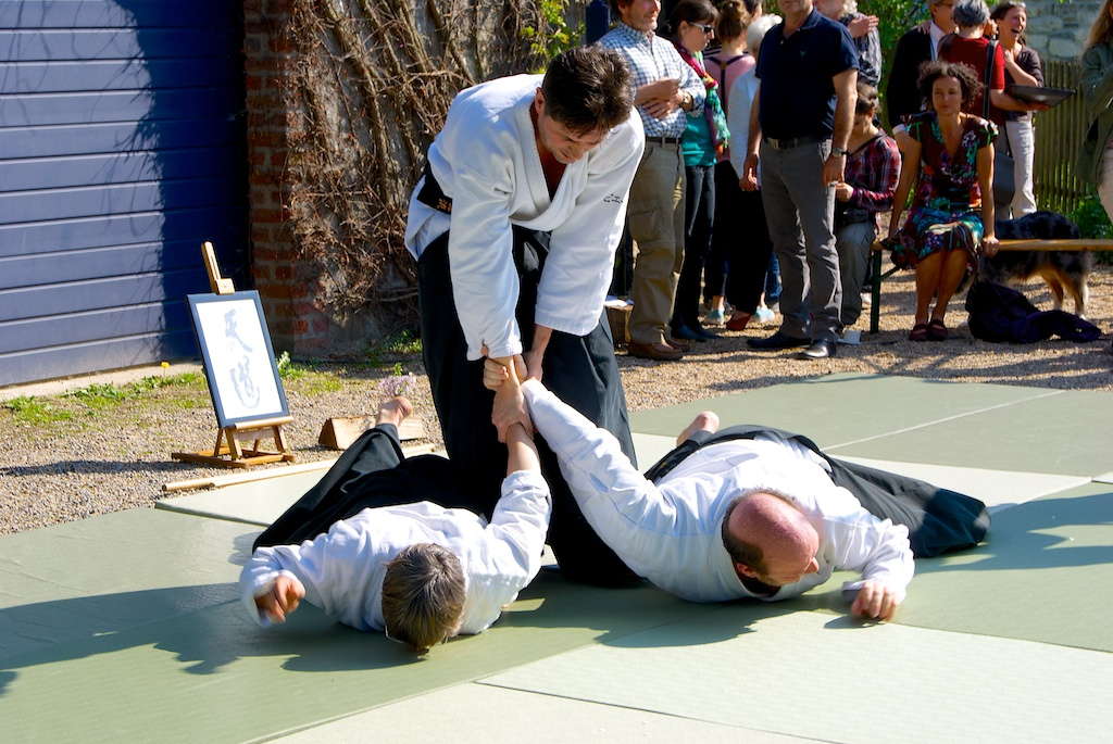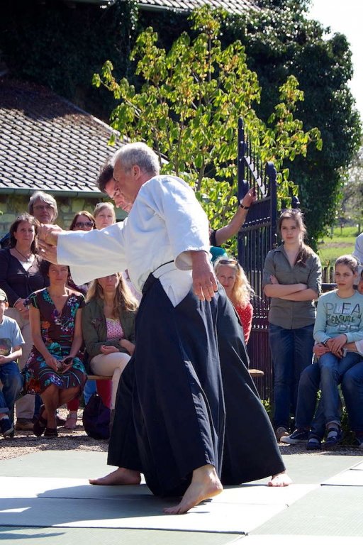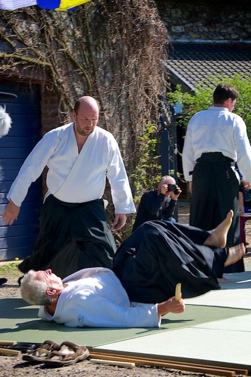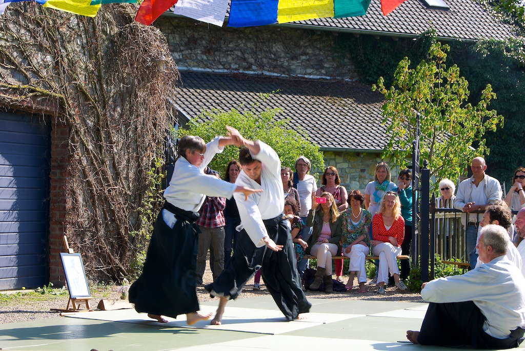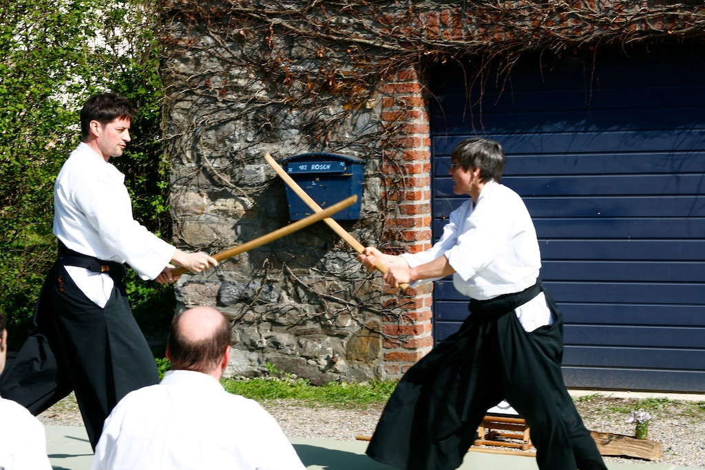 Zur Einweihungsfeier des ZaZen-Dojos von Manfred in Hombourg, auf der belgischen Seite der Euregio unweit von Aachen gelegen, waren wir eingeladen, unsere Kampfkunst vorzustellen. Der verantwortliche Wettergott meinte es gut mit uns, sodass wir unsere Matten im Freien aufbauen und unser Aikido in ungewohnter Freiluftatmosphäre mit direkter Sonnenbestrahlung vorführen durften. Übrigens ein ganz besonderes Trainingsgefühl, das Lust auf mehr macht.